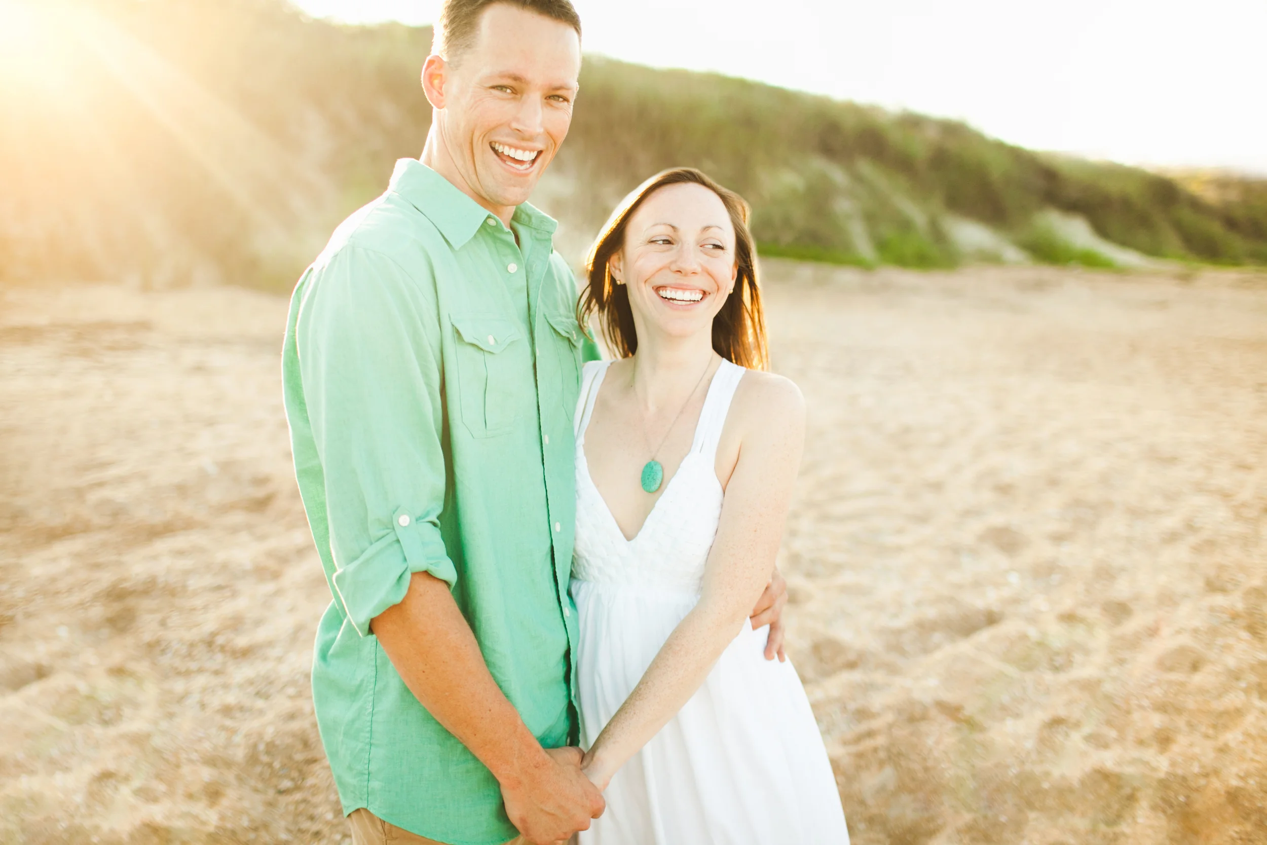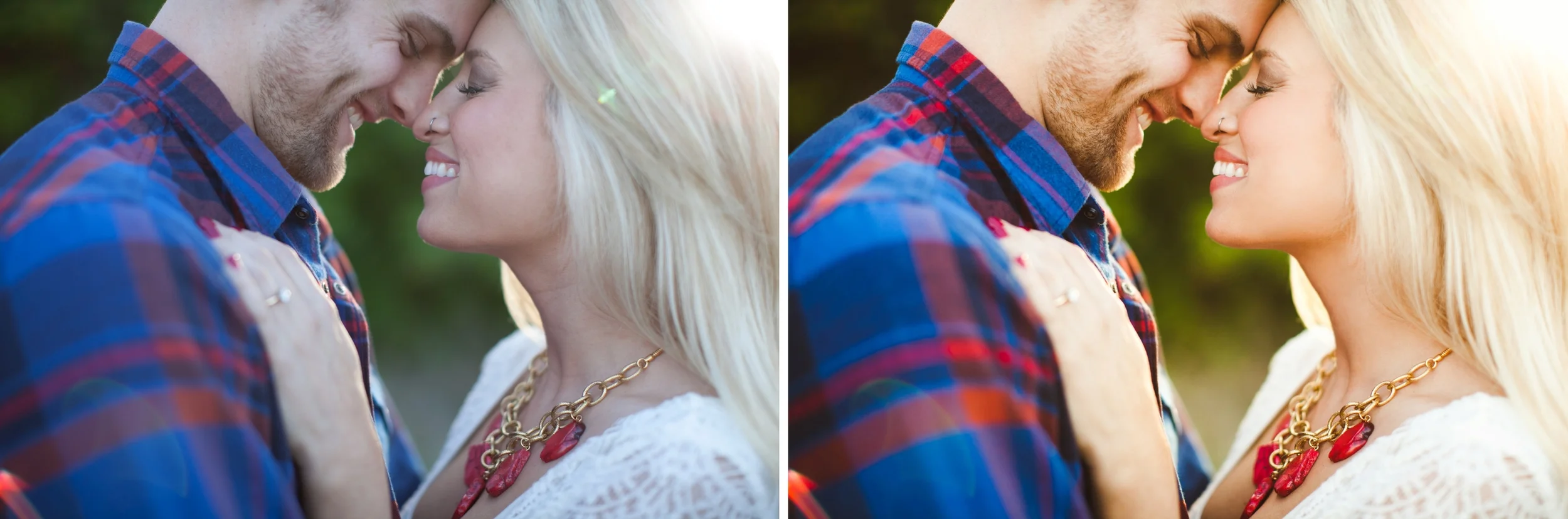 To create a bit of energy and movement into the frame (which matches and emphasizes the mood from my couple), I shoot with the sun just peaking over the lens hood into the frame. That introduced the streaks of light you can see coming in from the top left corner of the image.